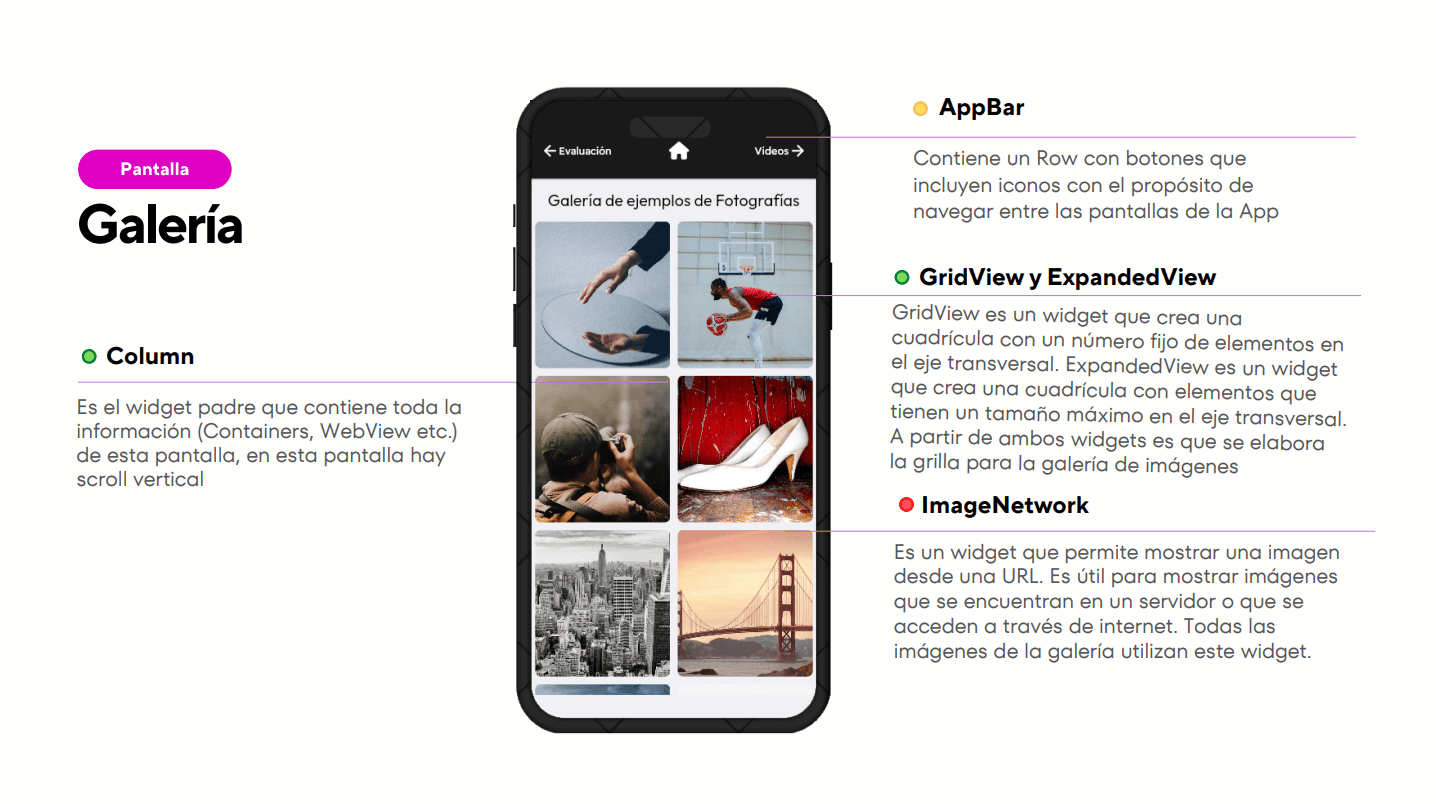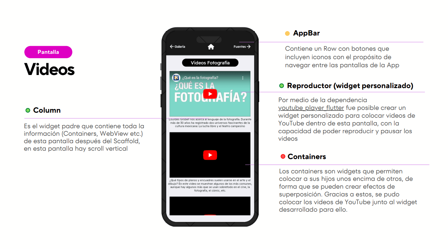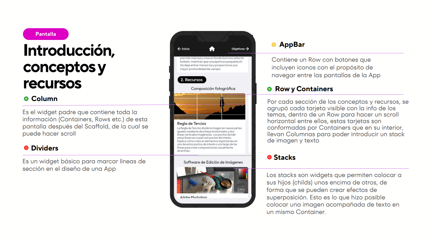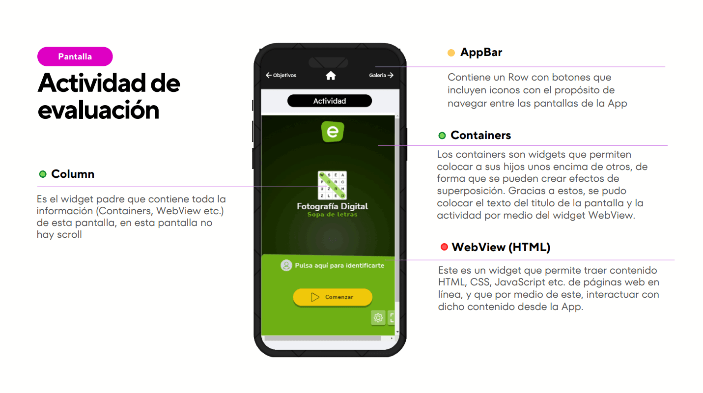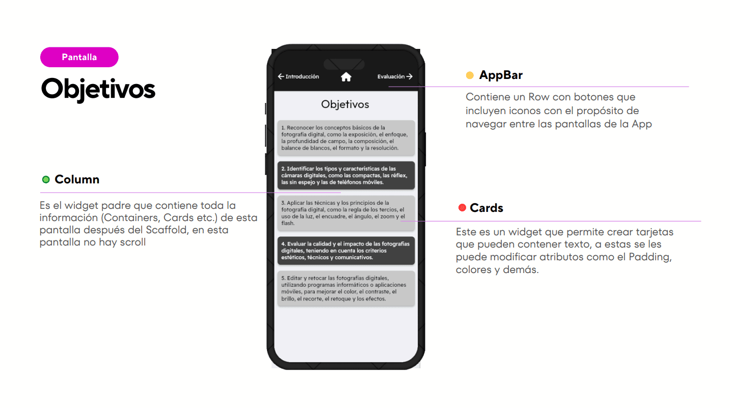 PicVision contiene 6 secciones que sirven para proporcionar un aprendizaje más interactivo como formato de aplicación móvil. Estas son: